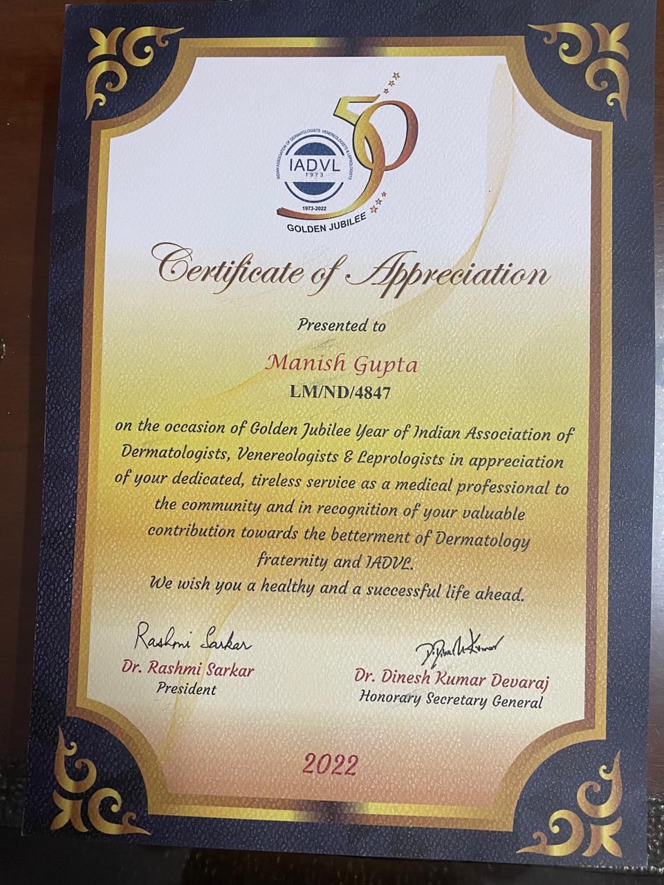 Dr. Manish is Life Member of Indian Association of Dermatologist (IADVL) and attending regular meetings and conferences from year 2005 onwards. Dr. Manish is also Attending workshops in DERMATO SURGERY, DERMATO PATHOLOGY, LASERS, BOTOX, FILLERS, THREAD LIFTING and ADVANCED COSMETIC PROCEDURES. Dr. Manish presented RESEARCH PAPER on ONYCHOMYCOSIS at DERMACON (2005) at SOUTH ASIA LEVEL. Dr. Manish got his research paper on ONYCHOMYCOSIS published in SKIN MED JOURNAL (2007).